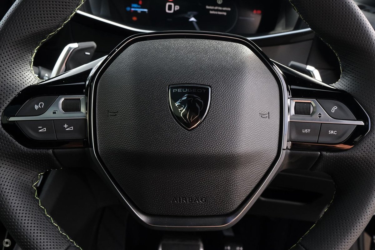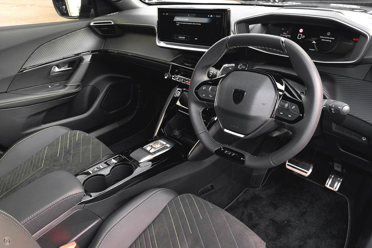 - Interior: 10-inch Peugeot i-Connect Touchscreen with Wireless Apple CarPlay and Android Auto, Fully Digital 3D i-Cockpit Instrument Display, Premium Leather and Alcantara Upholstery with Contrast Stitching, Heated Front Seats, Dual-Zone Climate Control, Wireless Phone Charging, Ambient Interior Lighting, and Smart Entry with Push-Button Start, Electric Sunroof