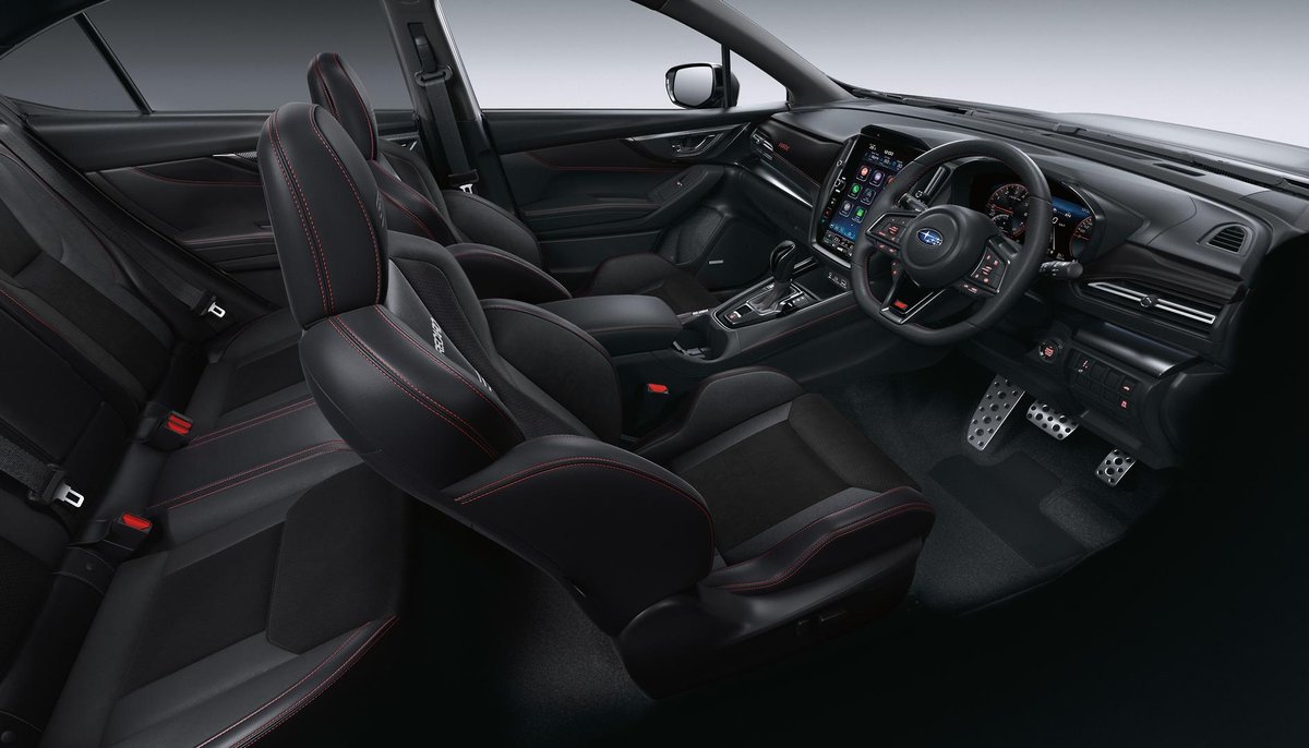 - Interior: Ultrasuede-Trimmed Seats with Red Stitching, Heated Seats, Touchscreen Infotainment with Wireless Apple CarPlay & Android Auto, Dual-Zone Climate Control, Drive Mode Select, Leather-Wrapped Steering Wheel, Smart Key Entry with Push-Button Start, Electric Sunroof, Premium Cabin Finish with STI-Inspired Details